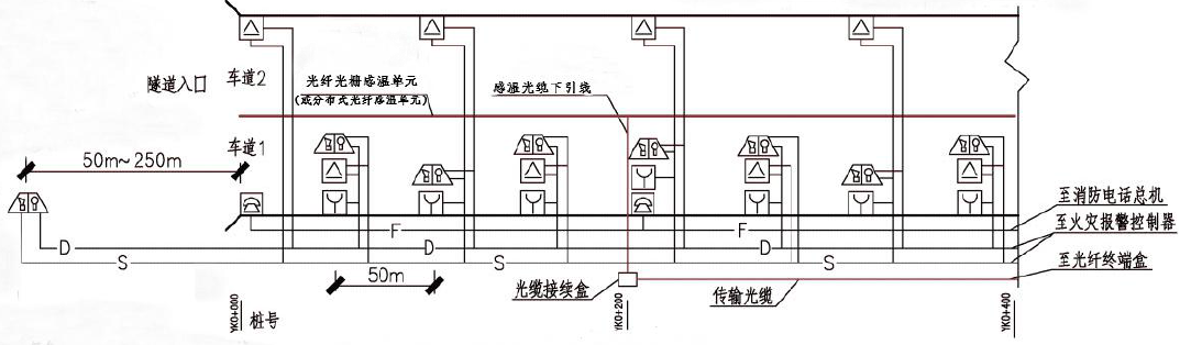 分布式光纖線型感溫火災(zāi)探測(cè)器(或光纖光柵線型感溫火災(zāi)探測(cè)器)應(yīng)設(shè)置在車道頂部距頂棚100mm~200mm,光纖光柵線型感溫火災(zāi)探測(cè)器的光柵間距不應(yīng)大于10m;每根分布式光纖線型感溫火災(zāi)探測(cè)器和光纖光柵線型感溫火災(zāi)探測(cè)器保護(hù)車道的數(shù)量不應(yīng)超過2 條;探測(cè)范圍要求整個(gè)隧道全部覆蓋無探測(cè)盲區(qū)。